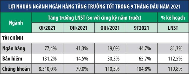 Đến thời điểm này, tất cả các ngân hàng niêm yết đã công bố báo cáo tài chính quý III/2021, các số liệu cho thấy được bức tranh lợi nhuận của ngành vẫn tương đối khả quan. Theo số liệu của Fiinpro, tăng trưởng lợi nhuận ngành ngân hàng quý III/2021 vẫn ở mức 19% và trong 9 tháng đầu năm 2021 lên đến 44,7%. Các ngân hàng đã hoàn thành 81,3% kế hoạch lợi nhuận, bất chấp những ảnh hưởng tiêu cực từ dịch bệnh. Ngành ngân hàng vẫn đang bước vững chãi qua giai đoạn khó khăn.