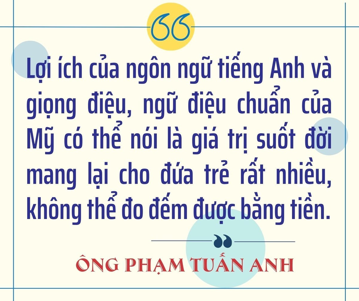 Đây là một món quà tuyệt vời cho các con, vì các con không chỉ có kiến thức giống như học sinh cùng tuổi ở Mỹ mà còn nói tiếng Anh đúng như một trẻ Mỹ. Sau này lớn lên nhờ ngữ điệu đó thì các cháu đi đâu cũng sẽ gặp nhiều điều thuận lợi.