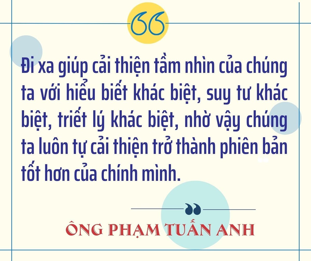 Tôi đặc biệt khuyến khích các bạn trẻ đi ra thế giới. Những bước đi đầu tiên chập chững thường khiến chúng ta lo sợ, e ngại. Đi ra thế giới không chỉ đơn giản như đi shopping, mà là cơ hội để hiểu bản thân và hiểu xã hội, hiểu đất nước, hiểu con người, hiểu chính mình.