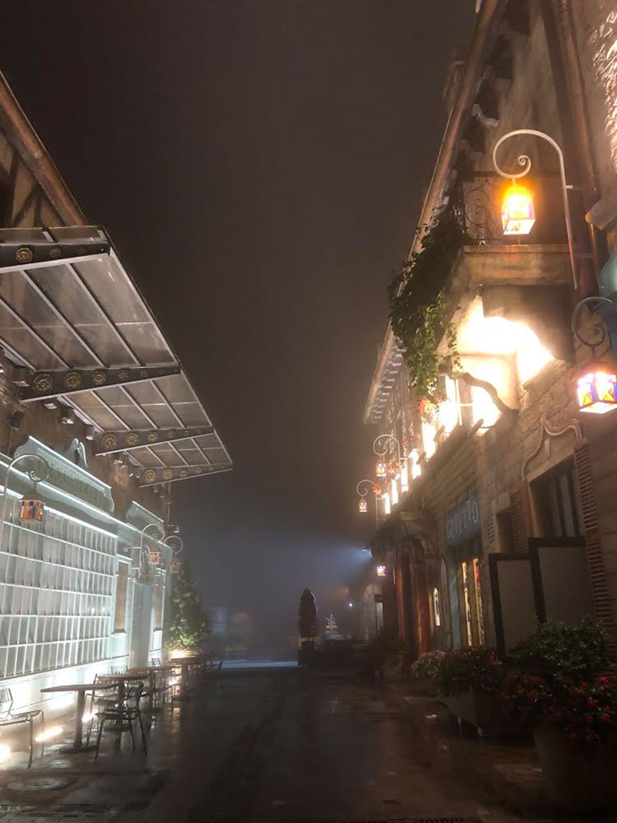 Trong cái se lạnh và tĩnh mịch của màn đêm, làng Pháp cổ in bóng nên nền trời mang một vẻ huyền bí với ánh đèn màu lấp lánh. Ban công phủ một lớp sương mù giăng kín, càng về đêm càng cảm nhận được rõ hơn cái tinh khiết của khí trời khí núi chốn bồng lai...