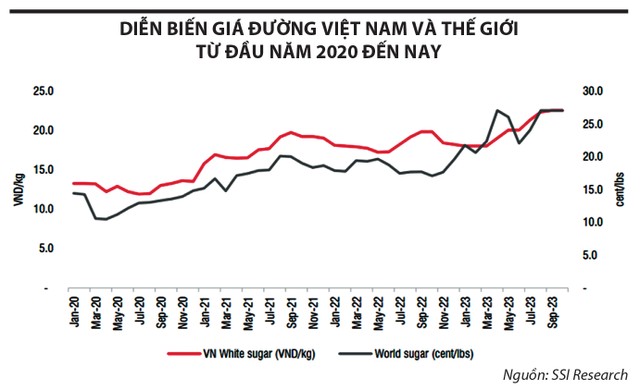 Theo Công ty Chứng khoán DSC, giá bán của các nhà máy đường gần đây đạt khoảng 26.000 đồng/kg, tăng hơn 40% so với đầu năm. Hiện nay, đường nhập khẩu chiếm khoảng 66% nguồn cung đường Việt Nam, nên giá đường trong nước nhiều khả năng sẽ duy trì ở mức cao và đồng pha với giá đường thế giới.
