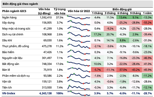 Nhờ chính sách nới lỏng tiền tệ gần đây của NHNN, các ngành nhạy cảm với lãi suất đã dẫn dắt đà phục hồi của VN-Index. Dịch vụ tài chính (tăng 17,2% so với tháng trước), Bất động sản (tăng 10,6%), Nguyên vật liệu (tăng 4,5%) và Ngân hàng (tăng 4,4%) tăng tốt trong tháng 3. Ngoài ra, Vận tải có mức tăng 4,5% nhờ sự hồi phục của ngành du lịch và chính sách mở cửa trở lại của Trung Quốc.