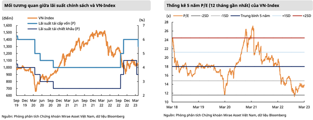 Về khía cạnh thận trọng, Mirae Asset cho rằng, kết quả kinh doanh quý I/2023 có thể cho thấy những con số không khả quan. Do đó, lựa chọn hàng đầu của chúng tôi vẫn là những cổ phiếu hưởng lợi từ đầu tư công, cũng như các cổ phiếu nhạy cảm với lãi suất như chứng khoán, bất động sản, xây dựng, và ngân hàng.
