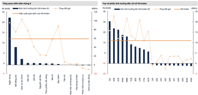 Sắc xanh lan tỏa đến hầu hết các nhóm ngành, dù nửa sau tháng 8 thị trường liên tục ghi nhận những nhịp rung lắc với biên độ gần 100 điểm, phản ánh sự luân chuyển mạnh mẽ của dòng tiền giữa các nhóm nhà đầu tư và cổ phiếu.