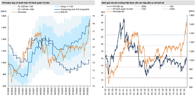 Trong khi đó, định giá của thị trường chứng khoán Việt Nam vẫn ở mức hấp dẫn so với lịch sử. Tính đến cuối tháng 8/2025, VN-Index vẫn đang duy trì dưới mức P/E bình quân 10 năm, cho thấy dư địa tăng trưởng còn rộng mở.