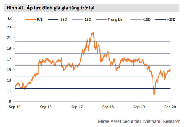 Thị trường đã trải qua giai đoạn tăng kéo dài từ cuối tháng 7 với mức tăng khoảng 15%, kéo theo áp lực định giá lớn dần khi VN-Index đang giao dịch ở mức P/E 15x, vượt qua mức trung bình 12 tháng (14,5x) và đang tiệm cận mức trung bình 5 năm 15,8x.