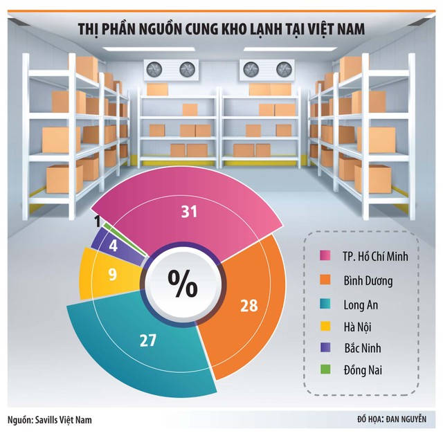 Cùng quan điểm, bà Trang Bùi, Tổng giám đốc Cushman & Wakefield Việt Nam nhận xét, so với các thị trường phát triển trong khu vực, thị trường chuỗi cung ứng lạnh ở Việt Nam vẫn còn khá non trẻ và manh mún. Thị trường kho lạnh phát triển hơn ở khu vực phía Nam, phần lớn là do sự tăng trưởng của ngành thủy sản và nông nghiệp; trong đó, tỉnh Long An tập trung nhiều kho lạnh do được kết nối chặt chẽ với vựa nông sản là Đồng bằng sông Cửu Long và có vị trí kề cận TP.HCM.