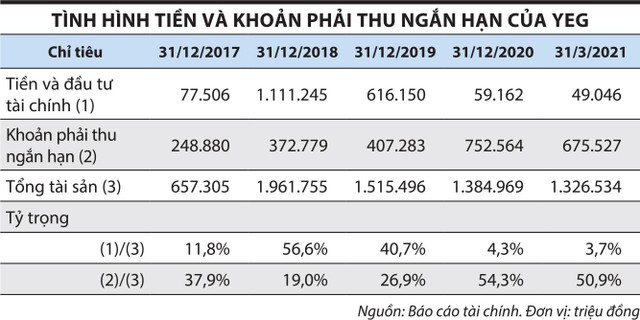 Cùng với việc thua lỗ, dòng tiền hoạt động kinh doanh cốt lõi của Yeah1 tiếp tục âm 901 triệu đồng, cùng kỳ âm 38,1 tỷ đồng). Tính tới 31/3/2021, lượng tiền mặt và đầu tư tài chính của Yeah1 tiếp tục giảm thêm 10,1 tỷ đồng so với hồi đầu năm, về còn 49 tỷ đồng sau giai đoạn giảm mạnh từ năm 2018.