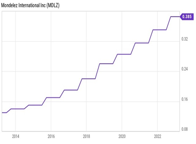 Tỷ suất cổ tức của Mondelez cũng rất hấp dẫn khi so sánh với mức chia trung bình của chỉ số S&P 500. Và đây không chỉ là một cổ phiếu trả cổ tức cao mà còn tăng trưởng theo thời gian. Mondelez đã tăng mức chia cổ tức hàng quý từ 0,13 USD lên 0,385 USD trong 10 năm qua, gần như theo đà tuyến tính.
