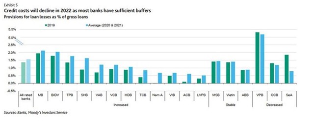 Theo đó, tỷ lệ nợ có vấn đề/tổng dư nợ cho vay tại các ngân hàng được xếp hạng đã giảm xuống 1,7% vào cuối năm 2021 từ mức 1,9% một năm trước đó. Moody's dự báo tỷ lệ nợ có vấn đề sẽ ổn định và áp lực dự phòng tại các ngân hàng sẽ giảm trong năm 2022 do hầu hết có đủ bộ đệm rủi ro.