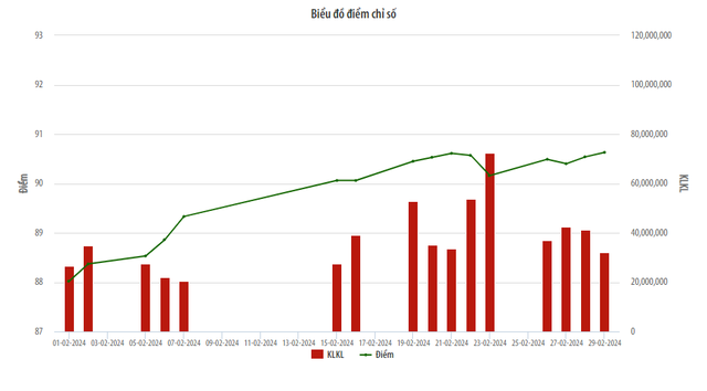 Chỉ số UPCoM-Index có xu hướng tăng dần từ đầu tháng và đóng cửa phiên giao dịch cuối tháng đạt mức cao nhất là 90,63 điểm, tăng 3,1% so với cuối tháng 1/2024.