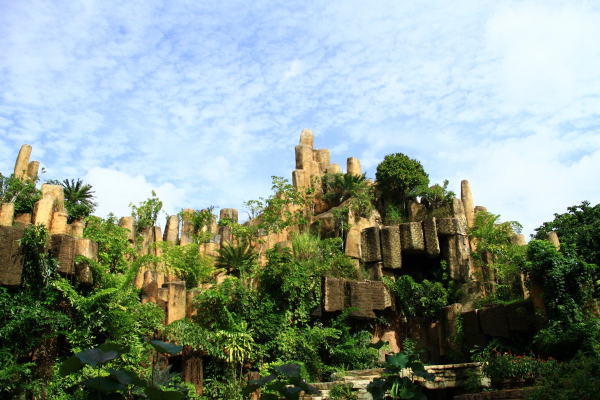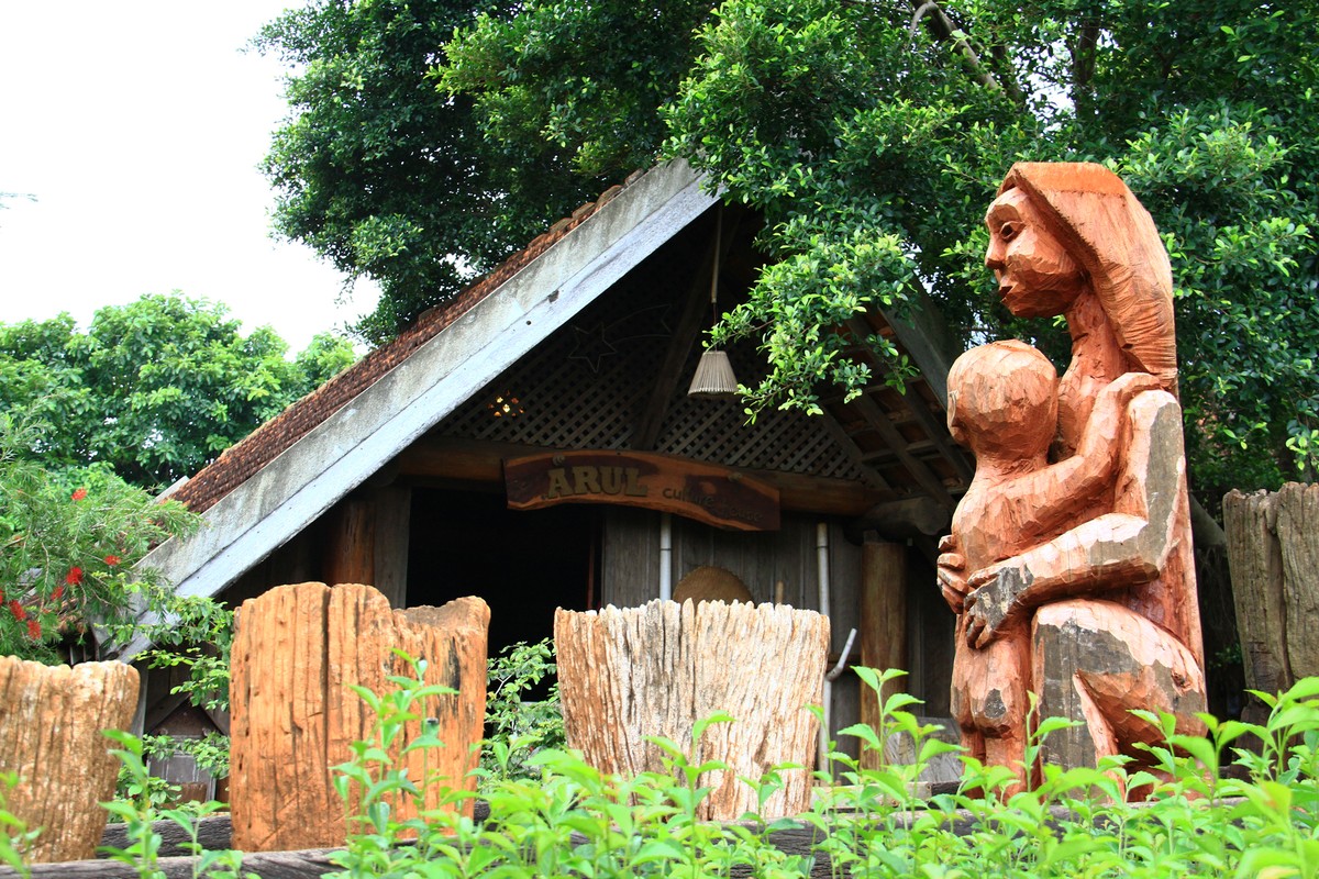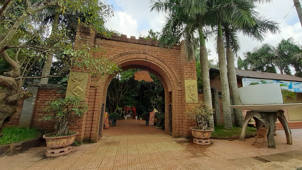 Một góc Làng Cà phê đặc trưng với các trụ đá riêng có của Tây Nguyên. Ảnh: Thành Nguyễn.