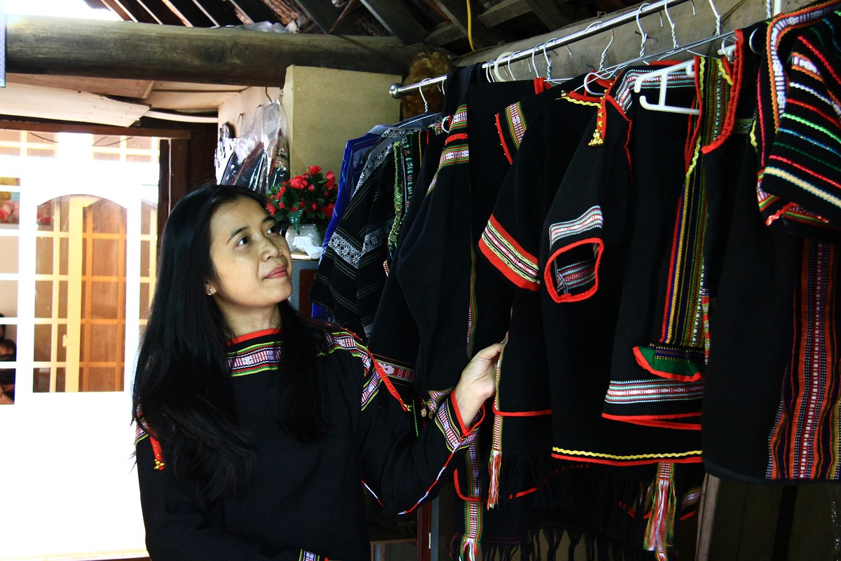 Chủ nhân Ê Đê Shop bên sản phẩm thổ cẩm Tây Nguyên. Ảnh: Thành Nguyễn.