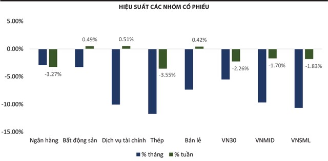 Trong khi đó, một số nhóm vốn hóa lớn chưa giảm nhiều đang có hiệu ứng “giảm bù”, áp lực chính đến từ nhóm ngân hàng và rổ chỉ số VN30. Hiệu ứng này chưa hoàn toàn kết thúc, việc thị trường mất ngưỡng hỗ trợ trung hạn có thể cần thêm 1 - 2 tuần để “vá” lại xu thế tích lũy trước đó. Thời điểm tất cả các nhóm cổ phiếu đều đã đủ thời gian cân bằng sẽ là thời điểm thị trường tổng lực “xông pha” đáng tin cậy hơn.