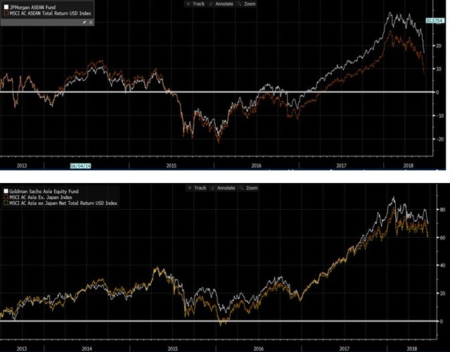 Dưới đây là đồ họa kết quả đầu tư của J.P. Morgan ASEAN Fund và Goldman Sachs Asia Equity Funds – hai quỹ đầu tư chủ động danh tiếng – so với các chỉ số mà họ tham chiếu.