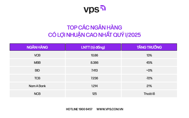 Vietcombank (VCB) tiếp tục giữ vững ngôi đầu với lợi nhuận trước thuế 10.860 tỷ đồng (+1,3%), trong khi đó MBBank (MBB) gây bất ngờ khi vươn lên mạnh mẽ với 8.386 tỷ đồng (+45%). Lợi nhuận trước thuế của BIDV (BID) đạt 7.413 tỷ đồng, gần như đi ngang và Techcombank (TCB) ghi nhận số liệu giảm 7,2% còn 7.236 tỷ đồng.