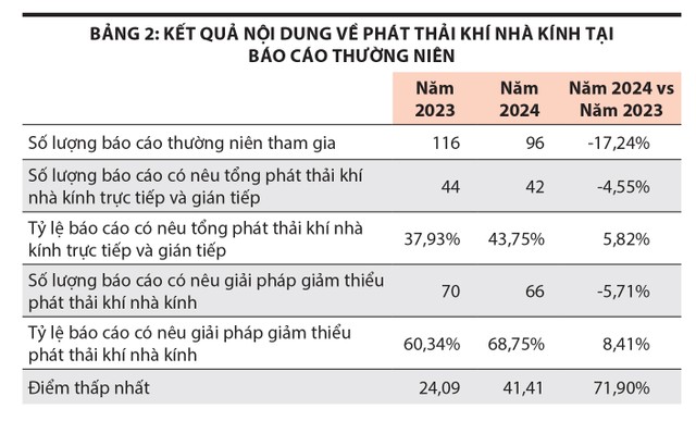 Năm 2024 là năm thứ hai bộ tiêu chí đánh giá báo cáo thường niên gồm câu hỏi bắt buộc về việc công bố thông tin tác động môi trường của công ty. Năm nay, số lượng báo cáo đề cập giải pháp giảm thiểu phát thải khí nhà kính giảm nhẹ so với năm ngoái do số lượng tham gia giảm, tuy nhiên, xét về tỷ lệ số báo cáo công bố nội dung này trên tổng số báo cáo tham gia, các tỷ lệ này đều tăng, cho thấy nhiều doanh nghiệp tham gia hạng mục có sự đầu tư trình bày về nội dung môi trường - xã hội trên báo cáo thường niên nhằm truyền tải thông tin của doanh nghiệp cho cổ đông và nhà đầu tư.(Bảng 2)