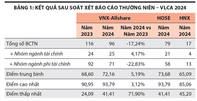 Số lượng báo cáo thường niên được đánh giá năm 2024 là 96 báo cáo, giảm 20 báo cáo (-17,24%) so với năm 2023, chủ yếu giảm từ nhóm phi tài chính.