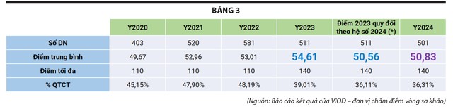 Bộ tiêu chí đánh giá chất lượng quản trị công ty được xây dựng theo hai cấp độ: 1. Tuân thủ các quy định pháp luật hiện hành của Việt Nam về quản trị công ty, dành cho công ty đại chúng và; 2. Áp dụng các thông lệ tốt về quản trị công ty. Năm 2024, với sự thay đổi trong cơ cấu điểm chấm, kết quả điểm của các doanh nghiệp cũng có sự thay đổi: (bảng 3)