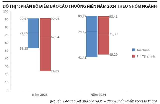 Nhìn chung, kết quả đánh giá báo cáo của mỗi nhóm đều có sự cải thiện so với năm ngoái, cụ thể ở điểm trung bình nhóm và điểm cao nhất mỗi nhóm. Với nhóm tài chính, số lượng báo cáo tham gia chấm không biến động nhiều, điểm trung bình đạt 74,32 điểm (tăng 2,3% so với năm 2023), điểm cao nhất đạt 93,79 điểm (tăng 3,44% so với năm 2023). Đối với nhóm phi tài chính, số lượng báo cáo giảm, điểm trung bình đạt 71,39 điểm (tăng 5,7% so với năm 2023), điểm cao nhất đạt 93,41 điểm (tăng 2,7% so với năm 2023).