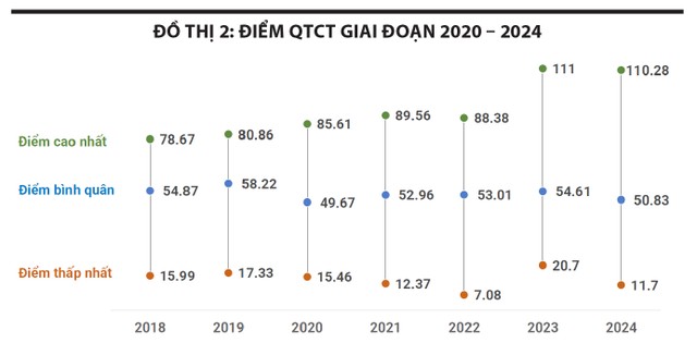 Điểm trung bình các báo cáo được chấm năm 2024 đạt 72,16 điểm, tăng nhẹ khoảng 5,19% so với năm 2023. Biên độ chênh lệch giữa điểm cao nhất và điểm thấp nhất cũng được thu hẹp, với điểm cao nhất là 93,79 (tăng 3,12% so với năm 2023), điểm thấp nhất là 41,41 điểm (tăng 71,90% so với năm 2023), qua đó, thể hiện sự nỗ lực cải thiện trong việc soạn thảo và công bố báo cáo thường niên của các doanh nghiệp niêm yết.