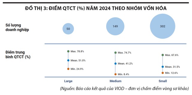 Năm nay, điểm quản trị công ty trên thị trường có sự chênh lệch lớn giữa doanh nghiệp có điểm cao nhất (110,28 điểm) so với doanh nghiệp có điểm thấp nhất (11,7 điểm) và mức độ chênh lệch này có sự nới rộng so với các năm trước. Nếu xét riêng từng nhóm vốn hóa, khoảng cách chênh lệch cũng có sự khác biệt. Theo đó, chênh lệch giữa doanh nghiệp đạt điểm cao nhất so với điểm trung bình của nhóm vốn hóa lớn là hẹp hơn so với nhóm vốn hóa vừa và nhỏ. Điều này cho thấy có sự đồng đều hơn về kết quả giữa các doanh nghiệp vốn hóa lớn và nhóm này cũng đạt được điểm quản trị công ty tốt nhất (điểm trung bình, điểm cao nhất và thấp nhất đều tốt hơn hai nhóm vốn hóa vừa và nhỏ). (Đồ thị 4)