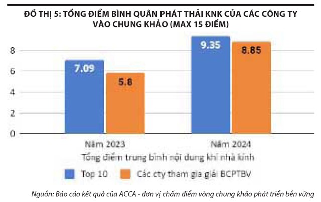 Các tiêu chuẩn quốc tế tiếp tục được áp dụng trong báo cáo phát triển bền vững của doanh nghiệp. Ngoài GRI, một số doanh nghiệp đã áp dụng thêm các khung báo cáo khác như CDP, SASB và SDG. Mô hình ủy ban ESG cũng được áp dụng nhiều hơn so với năm ngoái. Ngoài ra, vấn đề về đa dạng sinh học cũng bắt đầu được đề cập trong báo cáo của một số doanh nghiệp. Số lượng công ty đặt mục tiêu về phát thải khí nhà kính và báo cáo ở phạm vi 1 và 2 đã tăng đáng kể. Theo đó, 2/3 các doanh nghiệp lọt vào vòng chung khảo đã công bố dữ liệu về phát thải khí nhà kính. Điểm trung bình về phát thải khí nhà kính đã tăng so với năm 2023. Đặc biệt, có hai doanh nghiệp là Vinamilk và Sợi Thế Kỷ đã đặt mục tiêu phát thải theo SBTi. (đồ thị 5)