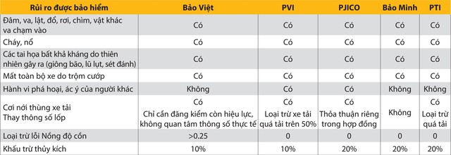 Thực tế, tại Việt Nam, tình trạng ngập úng cục bộ sau những cơn mưa lớn thường xuyên diễn ra ở các đô thị lớn như Hà Nội, TP.HCM…, cho nên sản phẩm bảo hiểm xe được nhiều người quan tâm. Thế nhưng, nhiều chủ xe ô tô vẫn luôn băn khoăn không rõ trường hợp nào sẽ bị từ chối chi trả bảo hiểm bởi cách giải quyết bồi thường, giảm trừ bảo hiểm của mỗi nhà bảo hiểm khác nhau (xem bảng).