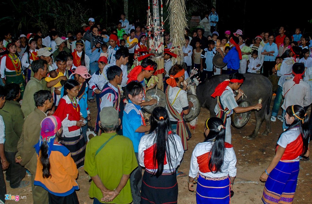 Trước khi diễn ra lễ đâm trâu, từ chiều tối hôm trước, con vật hiến tế được đưa vào buộc ở cây nêu. Các thành viên gia đình chủ lễ cùng dân làng thay nhau đi vòng quanh nhảy múa, gõ cồng chiêng suốt đêm làm say lòng du khách.