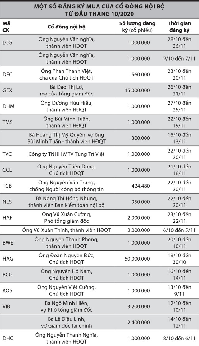 Kể từ đầu tháng 10/2020 đến nay, hàng chục thông tin đăng ký mua vào của các cổ đông nội bộ được công bố, trong đó có 15 doanh nghiệp ghi nhận khối lượng đăng ký mua từ 1 triệu đơn vị trở lên. Ngoài HAG, GEX, LCG, HAP, BWE còn có nhiều cổ phiếu được nhà đầu tư quan tâm như DHC, VIB, BCG… (xem bảng).