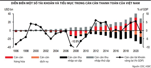 Một nghiên cứu của HSBC cho biết, mặc dù xuất khẩu phục hồi mạnh mẽ, nhưng thặng dư thương mại của Việt Nam trong quý I/2022 thu hẹp xuống mức tối thiểu 0,8 tỷ USD. Cán cân thương mại bị thu hẹp khiến lợi thế tài khoản vãng lai của Việt Nam giảm sút. Thực tế, Việt Nam ghi nhận thâm hụt tài khoản vãng lai 1,1% GDP năm 2021, lần thâm hụt đầu tiên trong vòng 4 năm. Bất chấp lượng kiều hối tăng mạnh, thặng dư thương mại nhỏ hơn, đạt khoảng 5% GDP, không đủ bù đắp cho thiếu hụt nguồn thu nhập chính và nguồn thu từ du lịch sụt giảm. Điểm sáng của năm 2022 chính là việc Việt Nam mở cửa lại biên giới, sẽ thúc đẩy doanh thu ngành du lịch. Tuy nhiên, tốc độ phục hồi có khả năng sẽ chậm.