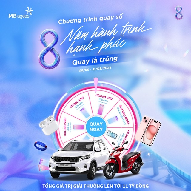 Chương trình “8 năm hành trình hạnh phúc” sẽ trao thưởng hàng tuần, hàng tháng cho các khách hàng đủ điều kiện tham dự, thực hiện quay số ngay trên ứng dụng MBAL Style. Phần thưởng mà khách hàng nhận được chính là ô quà tặng xuất hiện ngay tại vòng quay. Các khách hàng quay giải tuần có cơ hội nhận nhiều phần quà giá trị như: 04 giải Nhất mỗi giải là một điện thoại iphone 15, 12 giải Nhì mỗi giải là tai nghe airpod pro 2. Đặc biệt, 100% khách hàng tham gia quay số hàng tuần đều nhận được quà là các voucher khuyến mại trị giá lên tới 500.000 đ, cùng nhiều voucher giảm giá tới 40% khi mua sản phẩm trên MBAL Style, voucher tài khoản số đẹp hoặc thẻ Hi-Collection của MB.