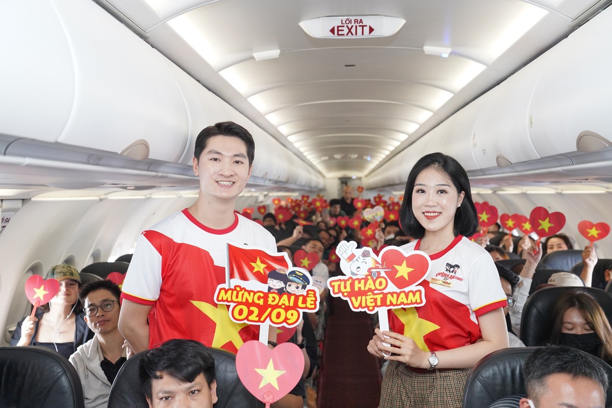 Phi hành đoàn Vietjet với hình ảnh lá cờ Tổ quốc trên ngực đón chào hành khách, khơi gợi niềm tự hào dân tộc đến với người dân cả nước, lan toả hình ảnh Việt Nam tươi đẹp, hiếu khách tới với bạn bè quốc tế.