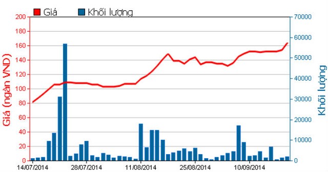 Biểu đồ giá, KLDG của cổ phiếu MWG trong 3 tháng qua. Nguồn: HOSE