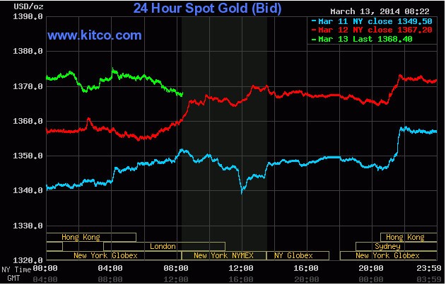 Trong giờ giao dịch châu Á và châu Âu hôm nay, 13/3, giá tiếp tục leo dốc theo căng thẳng ở Ukraine. Vào lúc 9h15 sáng, giá vàng giao ngay đã lên đến 1.376,5 USD/ounce. Giá sau đó đi ngang và bắt đầu quay đầu giảm từ lúc 6h tối nay. Đến 19h30, theo giờ Việt Nam, giá vàng quốc tế giao ngay là 1.367,4 USD/ounce, giảm gần 10 USD/ounce so với mức cao trong ngày.