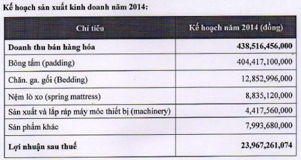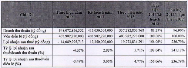 Tuy nhiên, chỉ tiêu lợi nhuận đã được hoạt thành với lãi ròng 9,27 tỷ đồng, trong khi năm 2012 lỗ 14 tỷ đồng. Lợi nhuận tăng trưởng mạnh chủ yếu do khoản hoàn nhập dự phòng khoản phải thu từ Công ty Mirae Fiber Tech đã được trích lập trong năm 2012.
