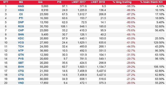 Top 20 doanh nghiệp giảm lợi nhuận năm 2018 (Vốn hóa: HOSE > 3.000 tỷ; HNX > 1.000 tỷ)