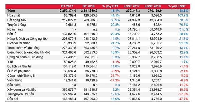 Tổng lợi nhuận ròng cả năm 2018 các doanh nghiệp công bố đạt khoảng 276,2 nghìn tỷ đồng, tăng trưởng 18,9% so với năm 2017. Tuy nhiên nếu loại trừ lợi nhuận đột biến của VHM (tăng gần 13.000 tỷ đồng lợi nhuận) thì con số này chỉ tăng trưởng 13,3%.