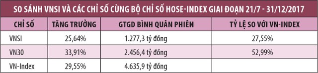 Về thanh khoản, chỉ số VNSI có giá trị giao dịch bình quân hàng ngày tính đến 29/12/2017 đạt gần 1.300 tỷ đồng, tương ứng khoảng 28% toàn thị trường. Tương tự, mỗi cổ phiếu thuộc danh mục VNSI có giá trị giao dịch bình quân đạt hơn 60 tỷ đồng, gấp 4,4 lần so với giá trị giao dịch bình quân 13,5 tỷ đồng của các cổ phiếu khác trên thị trường.