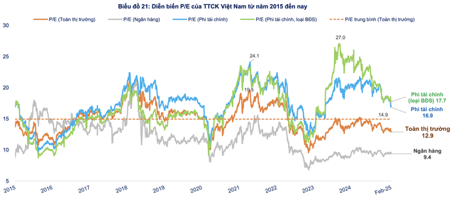 Xét theo từng nhóm, P/E toàn thị trường tiếp tục bị chi phối bởi ngân hàng, vốn đang giao dịch ở mức 9,4x, kéo mặt bằng định giá chung xuống thấp. Trong khi đó, nhóm phi tài chính có P/E ở mức 16,9x, nhưng nếu loại bỏ bất động sản, P/E của nhóm này cao hơn. Điều này cho thấy định giá của một số ngành ngoài bất động sản vẫn đang duy trì ở mức không thấp. Một số ngành có định giá cao hơn trung bình 5 năm như: hoá chất, vật liệu xây dựng, khai khoáng, điện, thép, vận tải thuỷ, sản xuất dầu khí,…