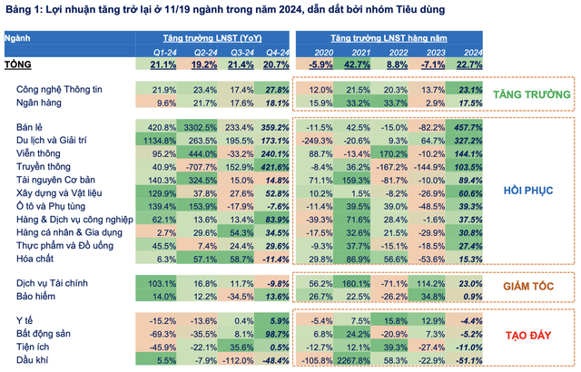 Ở nhóm hồi phục, bán lẻ, du lịch và giải trí dẫn đầu, duy trì mức tăng trưởng ba chữ số trong cả bốn quý của năm 2024 nhờ xu hướng hồi phục về cầu tiêu dùng. Xây dựng và vật liệu cũng phục hồi ổn định nhưng tốc độ thấp hơn.