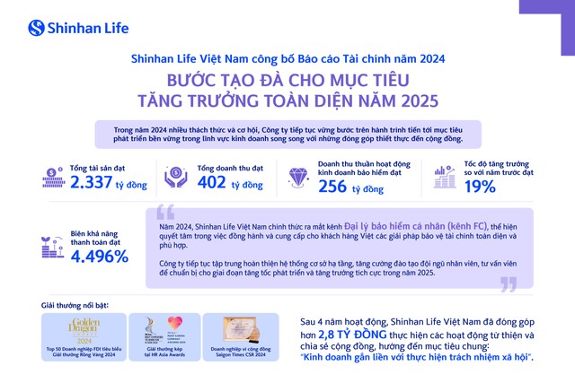 Trong năm 2025, Shinhan Life Việt Nam sẽ tiếp tục mở rộng hoạt động kinh doanh, đẩy mạnh các kênh phân phối, ra mắt những sản phẩm bảo hiểm với chi phí hợp lý để đồng hành và cung cấp cho khách hàng các giải pháp bảo vệ tài chính chất lượng và phù hợp nhất.
