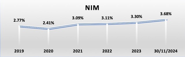 Tỷ lệ NIM ngày 30/11/2024 lên mức 3,68% so với 3,6% tại cuối quý 2 năm 2024. Ngân hàng dự kiến NIM từ nay cho tới hết năm 2024 sẽ duy trì trong khoảng 3,5-3,8%, với việc mặt bằng lãi suất tiếp tục duy trì thấp để hỗ trợ cá nhân và doanh nghiệp trong bối cảnh kinh tế còn nhiều khó khăn.