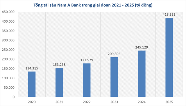 Tính đến cuối năm 2025, tổng tài sản của Nam A Bank đạt 418.333 tỷ đồng, tăng hơn 3 lần so với mức 134.315 tỷ đồng vào đầu nhiệm kỳ. Đặc biệt, năm 2025 ghi nhận bước tăng trưởng đột biến khi quy mô tài sản tăng hơn 173.200 tỷ đồng trong một năm, tương ứng mức tăng trên 70% - mức cao nhất trong ngành ngân hàng. Trước đó, Ngân hàng duy trì tốc độ tăng trưởng ổn định với mức tăng bình quân khoảng 14-18% mỗi năm, phản ánh chiến lược mở rộng quy mô theo lộ trình rõ ràng.