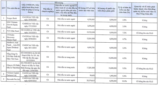 Theo danh sách nhà đầu tư dự kiến tham gia phát hành, ngoài GEX, còn nhiều tổ chức khác, trong đó, CTCP Đầu tư Thái Bình được phân phối lớn nhất là 15,6 triệu cổ phiếu và hiện tổ chức này đã nắm giữ gần 17,3 triệu cổ phiếu NLG. Nếu mua thành công, Đầu tư Thái Bình sẽ nắm giữ 9,5% vốn NLG sau phát hành.