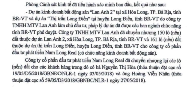 Cụ thể, theo Công văn số 741/PC03-Đ3 của Phòng Cảnh sát Kinh tế, Công an tỉnh Bà Rịa - Vũng Tàu, Nam Long Real là chủ đầu tư hợp pháp các lô đất đã bán cho khách hàng. Gồm 150 lô (nền) đất thuộc Dự án Lan Anh 2, xã Hòa Long, TP. Bà Rịa, tỉnh Bà Rịa - Vũng Tàu và 161 lô (nền) đất thuộc dự án thị trấn Long Điền, huyện Long Điền, tỉnh Bà Rịa - Vũng Tàu (nhận chuyển nhượng từ Công ty TNHH một thành viên Lan Anh).