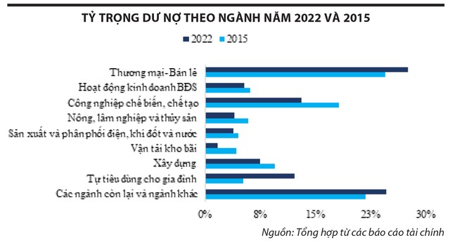 Cơ cấu tín dụng của hệ thống ngân hàng đã có sự dịch chuyển đáng kể trong 10 năm qua. Hai nhóm ngành nghề có tỷ trọng cho vay gia tăng nhiều nhất là thương mại bán lẻ và cho vay tiêu dùng hộ gia đình. Trong đó, cho vay tiêu dùng hộ gia đình tăng trưởng mạnh nhất từ 5% lên hơn 12% với phần lớn là nhu cầu cho vay tiêu dùng bất động sản.