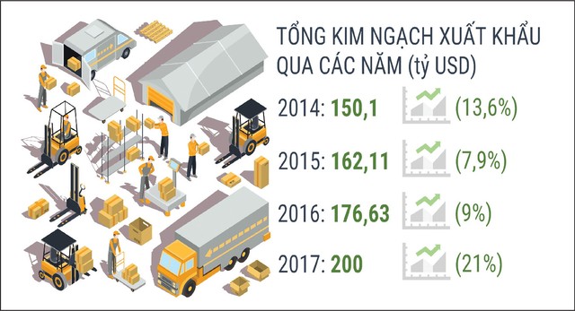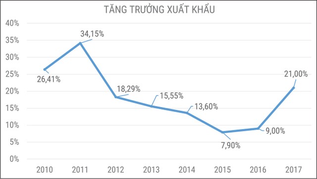 Nhìn lại diễn biến tăng trưởng xuất khẩu trong giai đoạn 2014-2017 có thể thấy, 2017 là năm lĩnh vực này ghi nhận nấc thang tăng trưởng mới. Cụ thể, mức tăng trưởng 21% của năm 2017 cao gấp 1,5 lần của năm 2014 (đạt 13,6%), gấp 3 lần con số của năm 2015 (đạt 7,9%) và 2,3 lần của năm 2016 (đạt 9%).
