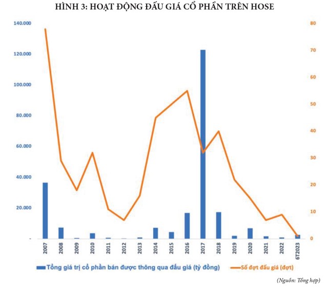 Tương tự, hoạt động đấu giá cổ phần trên HOSE cũng ảm đạm khi chỉ có 1 thương vụ đấu giá thành công cổ phần tại PG Bank do Petrolimex nắm giữ với giá trị 2.600 tỷ đồng. Trước đó, năm 2022, HOSE đã tổ chức 9 đợt đấu giá, trong đó có 1 đợt cổ phần hóa, 3 đợt thoái vốn của doanh nghiệp nhà nước và 5 đợt chào bán cổ phần ra công chúng. Tổng giá trị cổ phần bán được thông qua đấu giá cổ phần đạt 939 tỷ đồng, giảm 43% so với năm 2021 và là mức thấp nhất kể từ năm 2013. (Hình 2, 3)