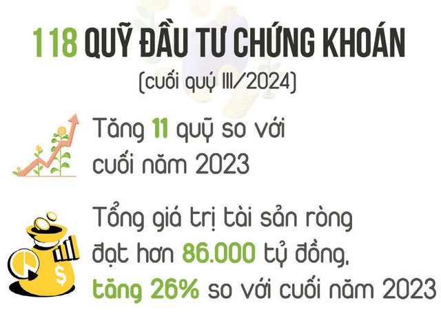 Nhóm định chế tài chính trung gian thứ hai có vai trò quan trọng với thị trường chứng khoán là các công ty quản lý quỹ. Tính đến hết quý III/2024, thị trường có 118 quỹ đầu tư chứng khoán, tăng 11 quỹ so với năm 2023, bao gồm 34 quỹ thành viên, 64 quỹ mở, 16 quỹ ETF, 3 quỹ đóng và 1 quỹ bất động sản. Tổng giá trị tài sản ròng (NAV) của các quỹ đạt hơn 86.000 tỷ đồng, tăng 26% so với cuối năm 2023.